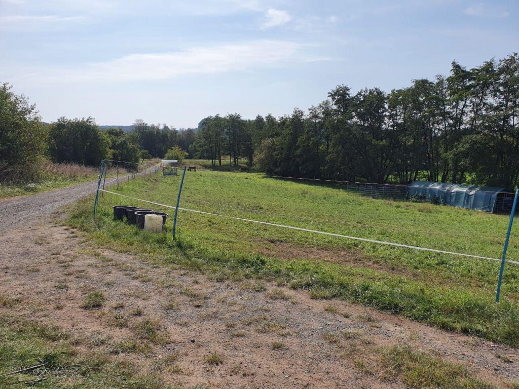 zum Parkplatz am Keltentor an einer Pferdekoppel