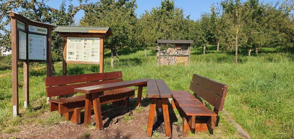Die Senionrenwerkstatt, in Zusammenarbeit mit dem Obst- und Gartenbauverein Biebertal-Rodheim e.V. und dem NABU Rodheim-Bieber e.V. baute diese Sitzgruppe mit Informationstafel sowie ein Insektenhotel..